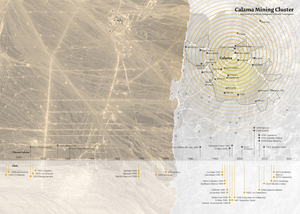 The main objective of the research project was to understand and redefine the role of Calama in relation to its territory, the mining industry, and the imaginary of its inhabitants. With a team of researchers and students, we studied the systems of water, waste, food, and transportation in the city and the region; we studied its evolution over time in relation to the changes happening in the mining industry highlighting the specific dynamics generated by its temporal and spacial characteristics. Three main thesis led the development of the research project, corroborated by demographic and geographical data, maps, and photographic essays. The first one, is that historically, and by the general public, Calama was conceived as the mining city of Chuquicamata and Rodomiro Tomic, the two main mining sites next to it both owned by CODELCO. This led to a vicous circle in which the company is seen as responsible for all the negative externalities that are impacting the city but it is also claiming the right to consider the urban territory as part of the mining infrastructure; with an evident loss in democratic sovereignity over the urban territory which especially affects those that are not working for the mining company. We calculated instead that a cluster of 14 mines gravitates around Calama and that the area should therefore take this into account when defining urban transformations and policies. Second, every mining operation is necessarily ephemeral: extractions sites and camps are built with an expiration date, corresponding to the exhaustion of resources, their obsolesence, or technological innovation. Many of the plans for Calama are not taking into account its future after-mining. Finally, the bi-univocal relation between mining industry and workers leads to an understanding of Calama as a camp, an efficient organization of space and infrastructure in order to guarantee the well functioning and productivity of the industry.Several populations inhabit instead the city, any of which characterized by different spacial and temporal projection. The indigenous population for instance, has been living on the oasis for thousands of years, lives of its resources, honors the anchestors buried next to it. A vision for the future after-mining may be found there.